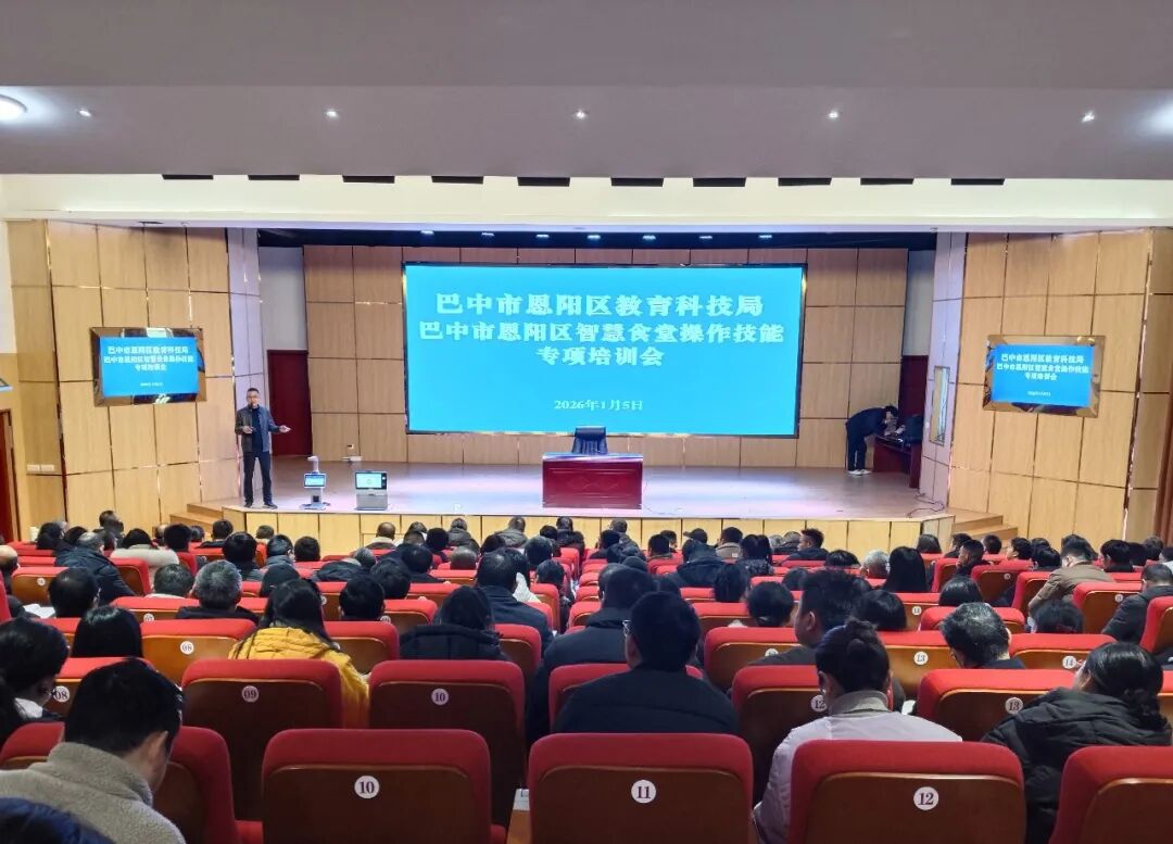 1月5日,巴中市恩阳区智慧食堂操作技能专项培训在文治实验学校举行,全区公办中小学智慧食堂平台数据录入、出入库、留样管理人员等参加培训。