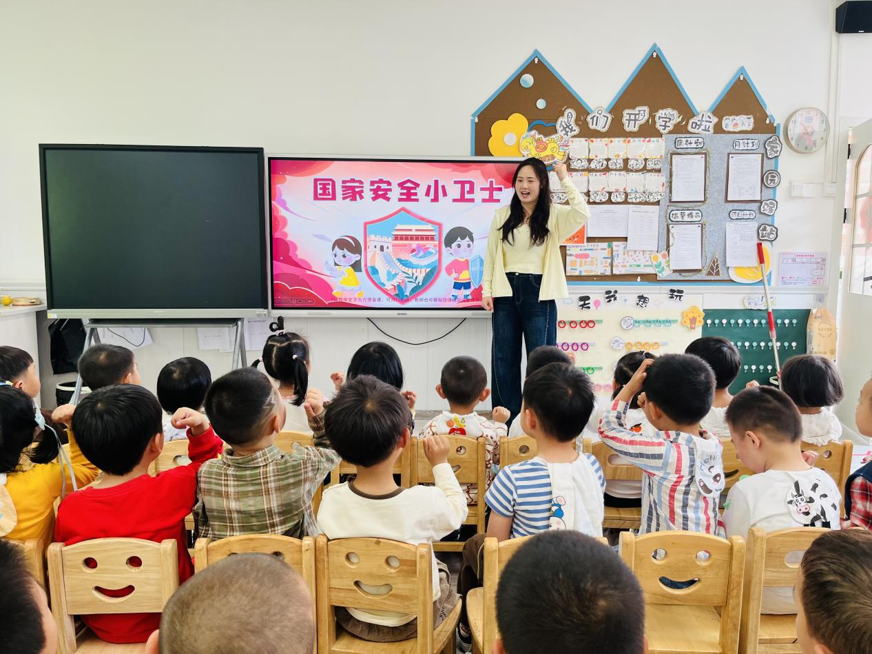 园所遵循分龄施教原则,分层开展特色活动,班级活动中小班以绘本、儿歌、游戏感知安全常识;中班通过情景模拟、手工制作提升安全判断能力;大班以知识抢答、绘画创作深化国家安全认知。园所活动中通过LED屏滚动播放安全标语、布置主题宣传墙营造浓厚的安全教育氛围;并向全体师幼发出“争做国家安全小卫士”倡议。