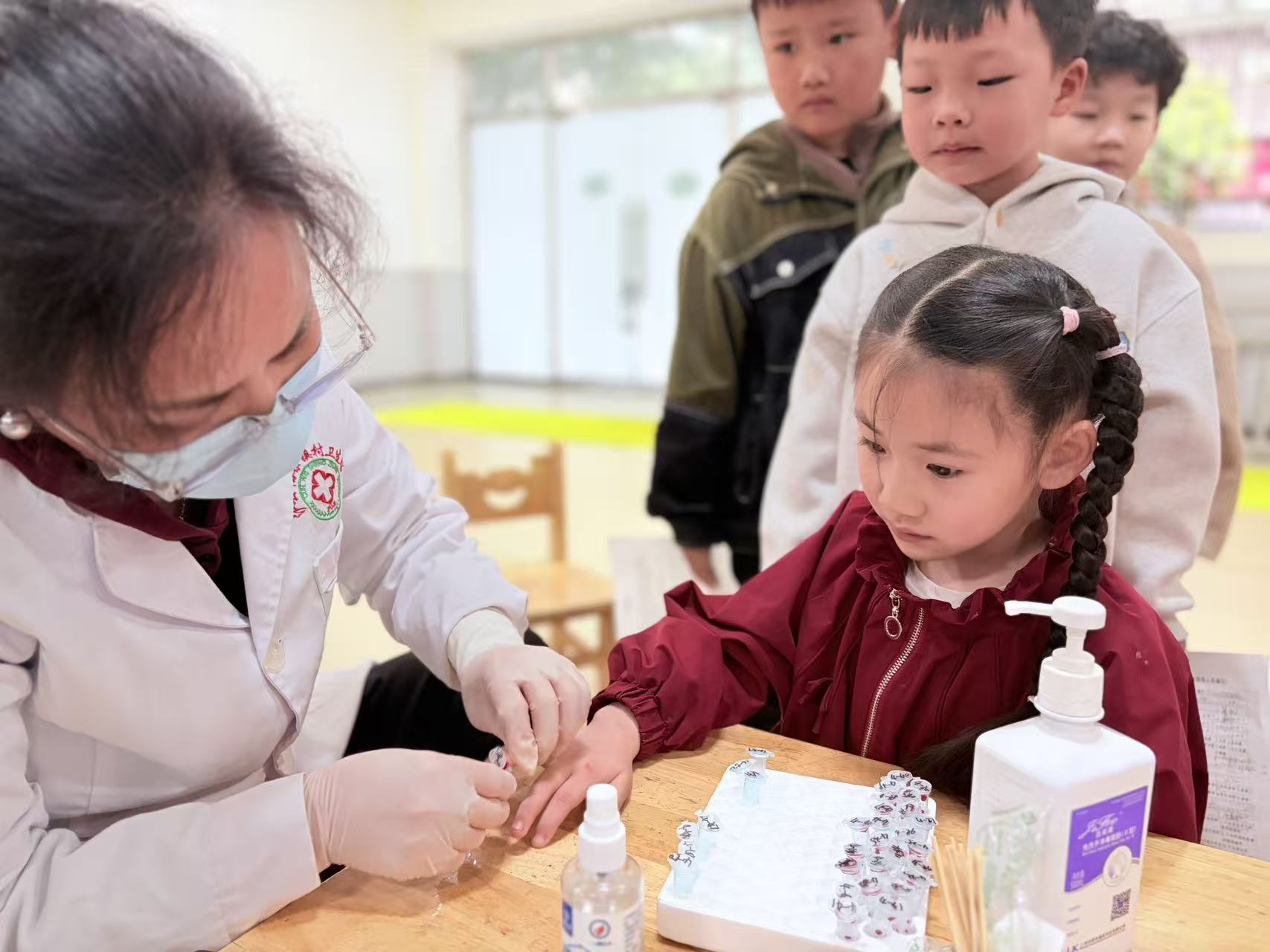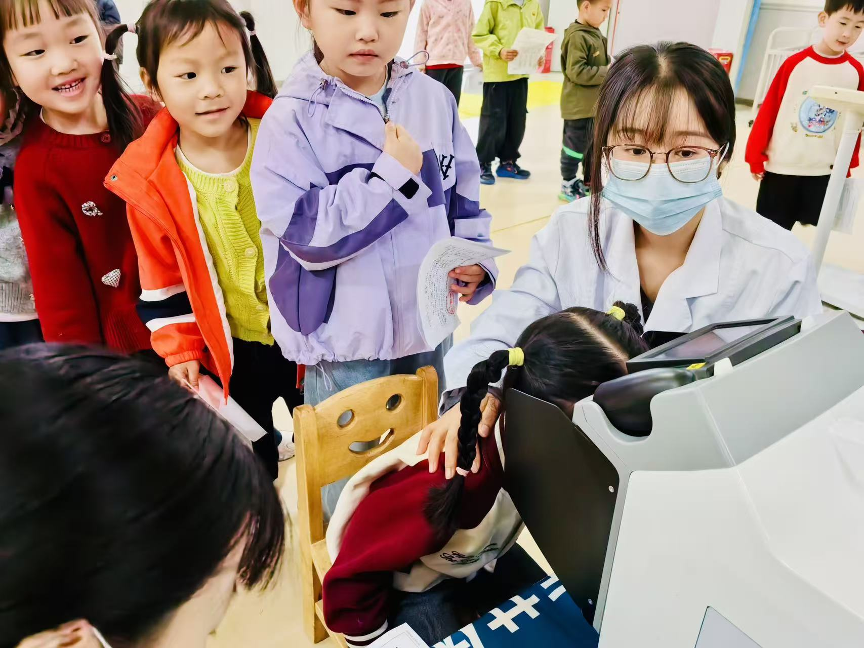 体检现场秩序井然,在老师们的耐心引导和安抚下,孩子们有序排队,积极配合医护人员完成各项检查。本次体检涵盖身高、体重测量、视力筛查、口腔检查、心肺听诊、血常规等多项内容,全面覆盖幼儿生长发育关键指标。医护人员细致地为每一位幼儿检查身体,认真记录各项数据,同时针对幼儿用眼、口腔护理等方面,向老师和家长给出专业的健康指导。